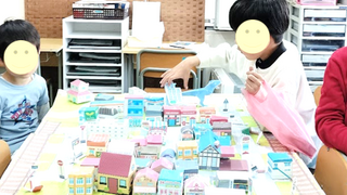 みんなでジオラマを作りました。街をつくるには、どんなものが必要か、事前に話し合い。その後、厚紙を使って、建物・乗り物・鉄橋などを作成。ベースに組み合わせて、完成!